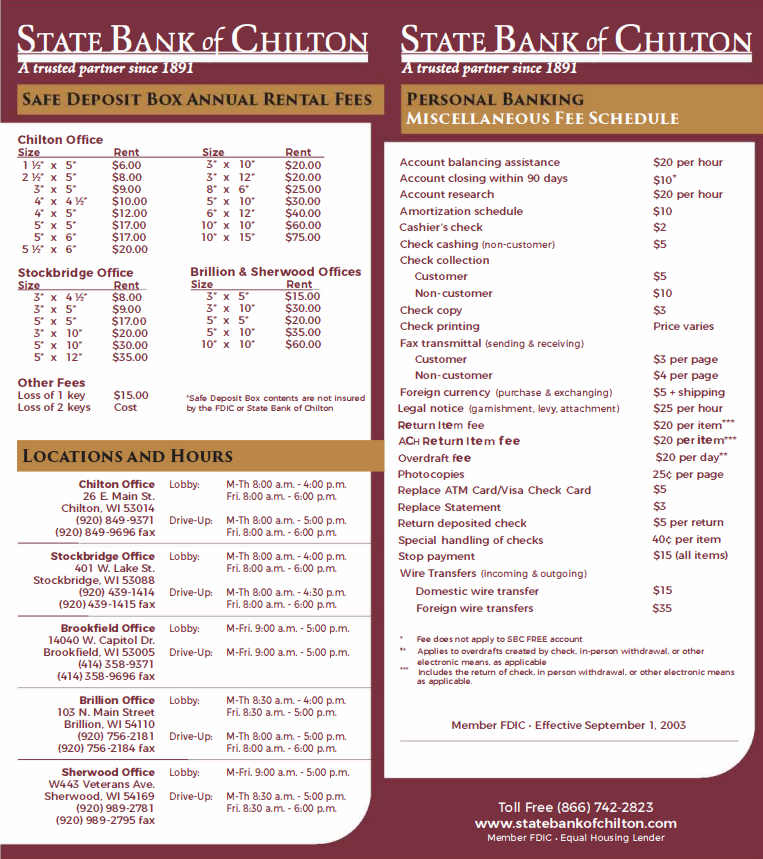 Safe Deposit Boxes: For pennies a day, State Bank of Chilton offers safe deposit boxes in a wide range of sizes at our Chilton, Stockbridge, Brillion, and Sherwood banking locations. A safe deposit box is for more than fine jewelry — you can use this service to protect important documents like your insurance policies, birth and marriage certificates, stocks and bonds, wills and deeds, titles to real estate and automobiles, and certificates of deposit.